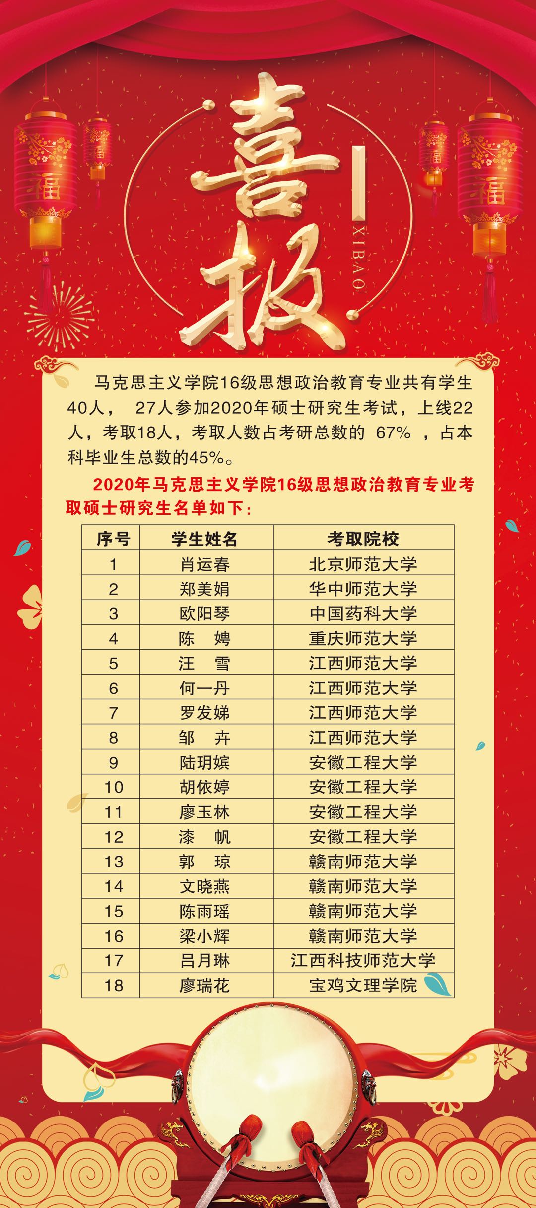 马克思主义学院2016级思想政治教育专业共有学生40人,其中27人参加2020年硕士研究生考试,上线22人,考取18人,录取人数占报名总人数的67%,占本科毕业生总数的45%。录取院校有北京师范大学、华中师范大学、中国药科大学等国内知名高校。