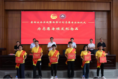 出征仪式上,邱晓辉为西部计划志愿服务团授旗,刘林芽为暑期社会实践服务团授旗。邱晓辉、刘林芽为到场的所有西部计划志愿者佩戴绶带并赠送纪念品。