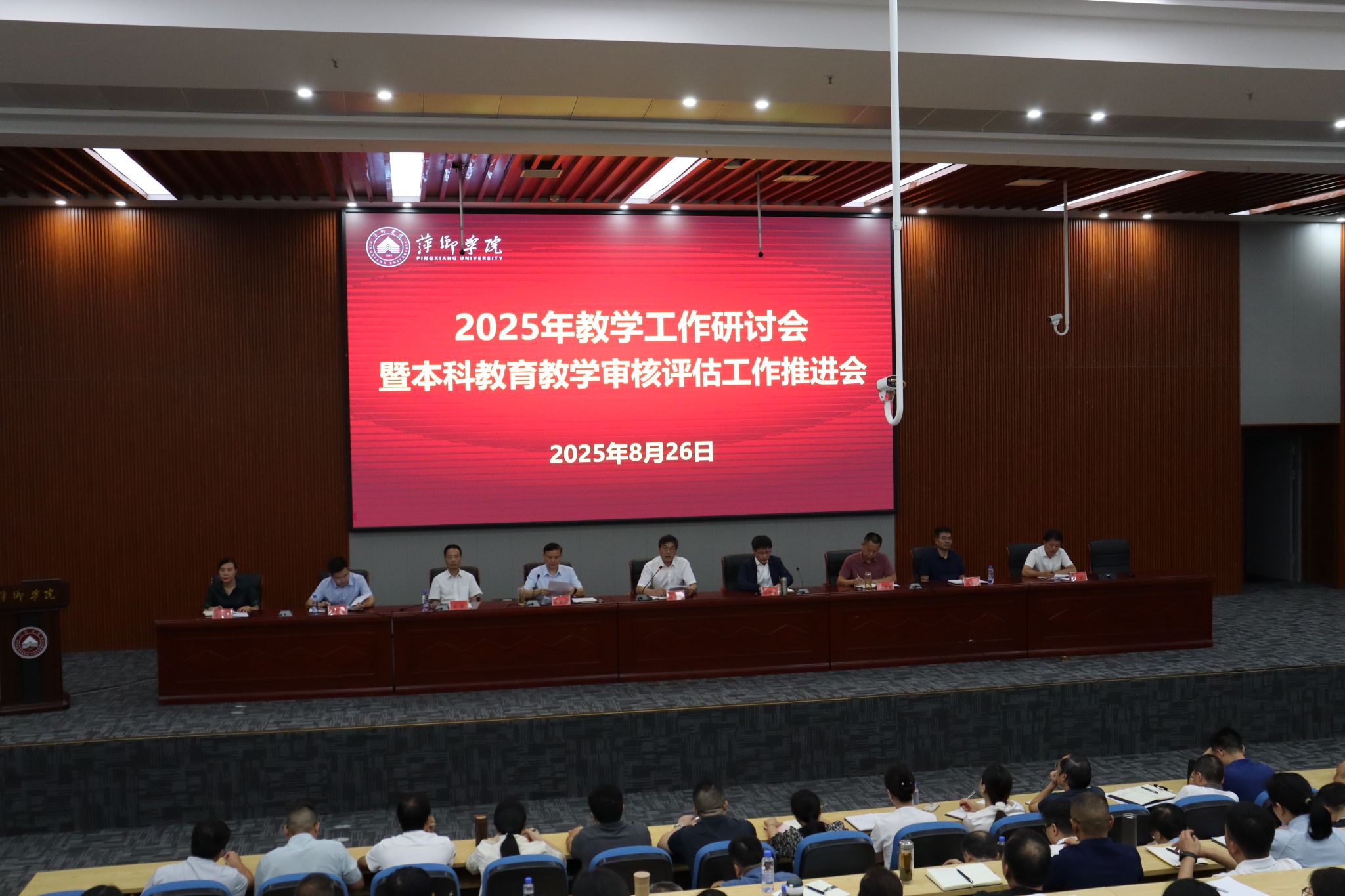 8月26日,必赢在天泉楼学术报告厅召开2025年教学工作研讨会暨本科教育教学审核评估工作推进会。全体在家校领导、副处级以上干部、各二级学院教研科长、教研室主任、实验实训室主任、专业负责人、教师代表以及评建办全体成员参加会议。会议由校党委委员、副校长陈永国主持。