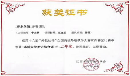 李文静荣获第十六届“外教社杯”全国高校外语教学大赛江西赛 区本科大学英语综合课组二等奖