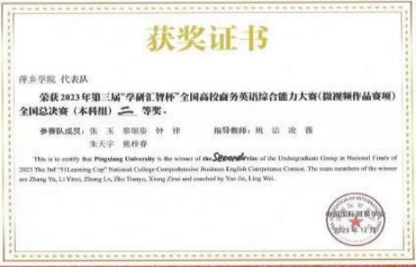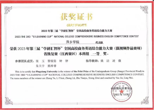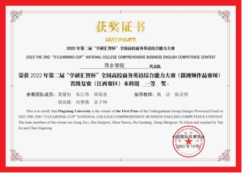 第二届“学研汇智杯”全国高校商务英语综合能力大赛江西赛区本科组一等奖