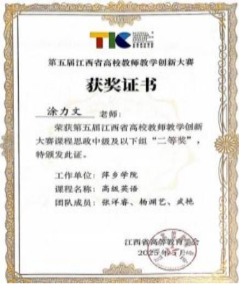 涂力文荣获第五届江西省高校教师教学创新大赛课程思政组二等奖