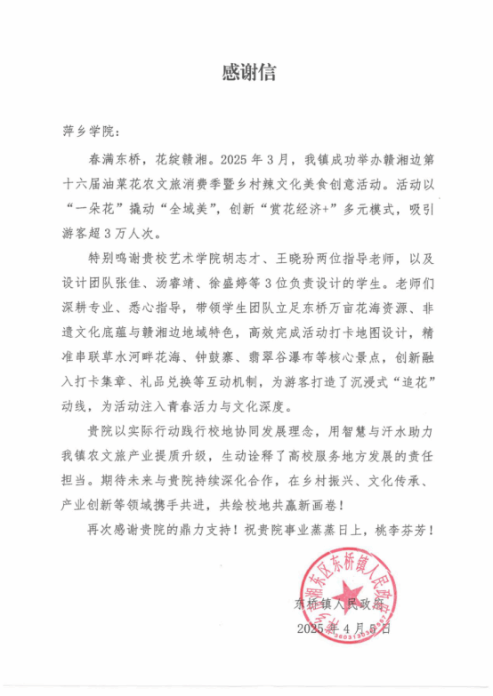 近日,必赢艺术学院收到来自湘东区东桥镇人民政府的一封情真意切的感谢信,信中对学院师生团队在该镇成功举办的“赣湘边第十六届油菜花农文旅消费季暨乡村辣文化美食创意活动”中所作出的卓越贡献表示高度赞赏与诚挚感谢。这不仅是校地协同发展的生动实践,更是艺术学院将教学科研与服务地方经济社会发展紧密结合的丰硕成果展现。