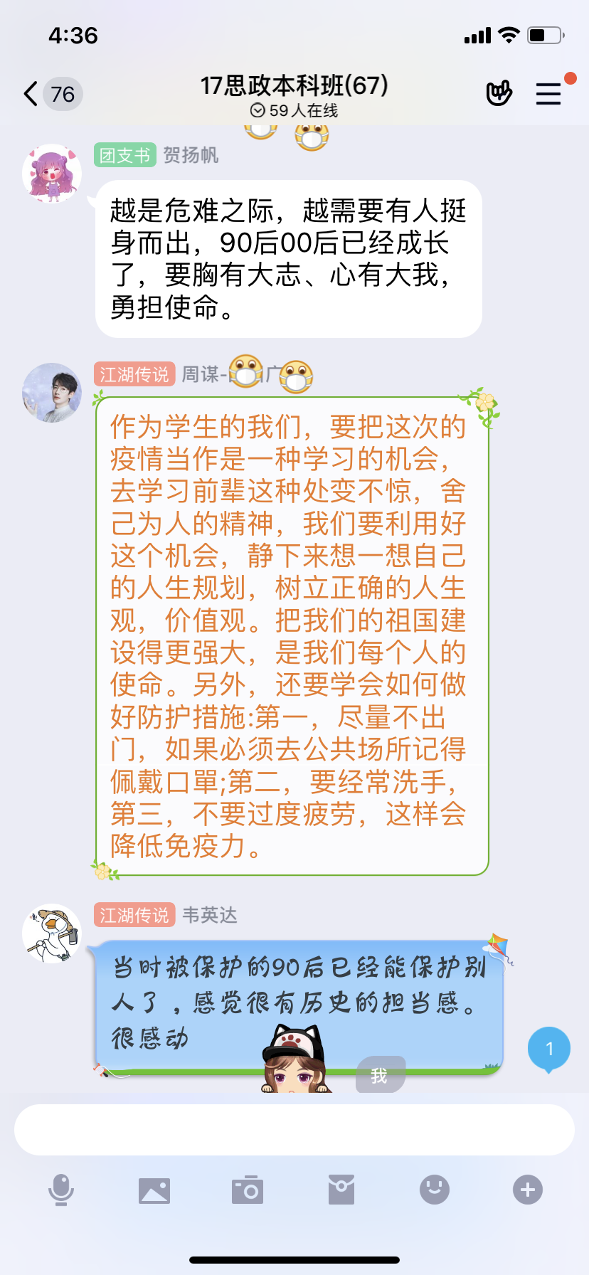 17思政李文玉:哪有什么岁月静好,只是有人替你负重前行。灾难面前,没有谁能置身事外,从不存在一个人的桃花源。全国大学生同上一堂疫情防控思政大课令我受益匪浅,刻骨铭心。新型冠状病毒肺炎虽然来势汹汹,给我们的生活都蒙上了厚厚的阴影。但是,作为学生的我们,要把这次的疫情当作是一种学习的机会,去学习前辈这种处变不惊,舍己为人的精神,我们要利用好这个机会,静下来想一想自己的人生规划,树立正确的人生观,价值观。把我们的祖国建设得更强大,是我们每个人的使命。