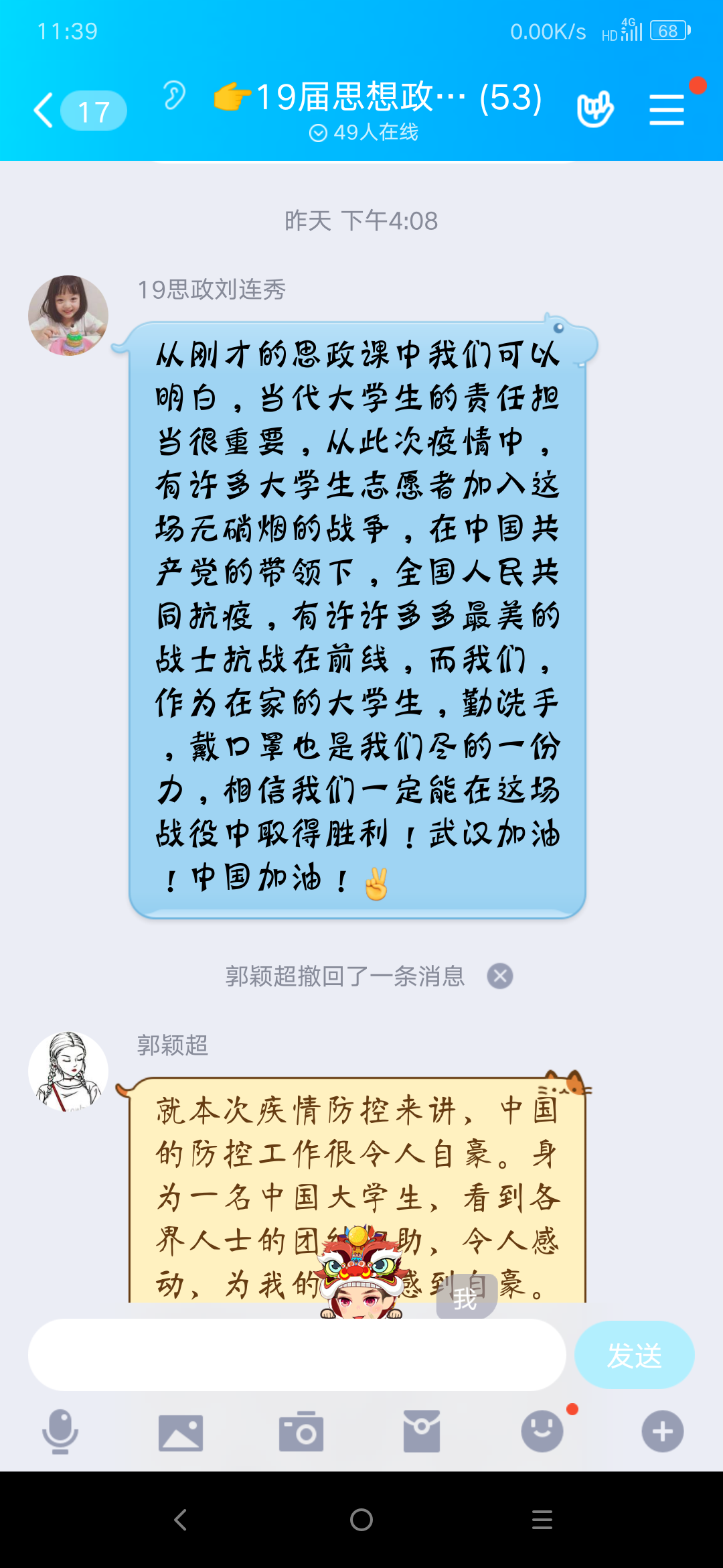 19思政廖涌:从今天的全国大学生疫情防控思政课中我学到了很多知识。面对新型冠状病毒感染的肺炎疫情加快蔓延的严重趋势,全党全局全国各民族人民都站在一起,心连着心,携手抵抗疫情。深刻体会到中国共产党是最高领导力量,是中国特色社会主义制度的最大优势。作为当代大学生,我们更是应该承担起应有的责任。在党和国家的正确领导组织和领导下,相信我们定能取得疫情防控战的胜利,中国加油!中国必胜!