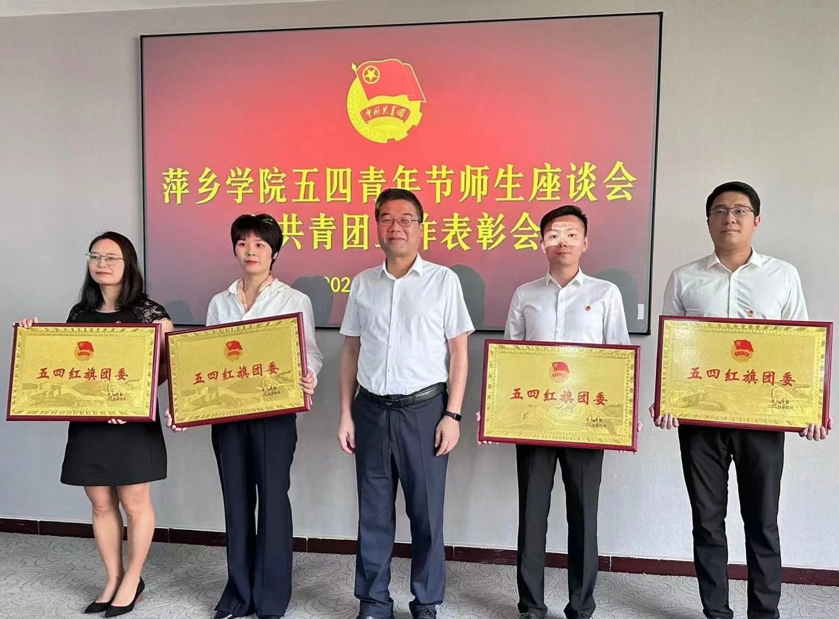 邱晓辉为获奖单位颁奖,获奖单位代表商学院团委书记易晶晶、第七届萍乡青年五四奖章获得者刘耀等9位优秀青年师生代表作了交流发言。